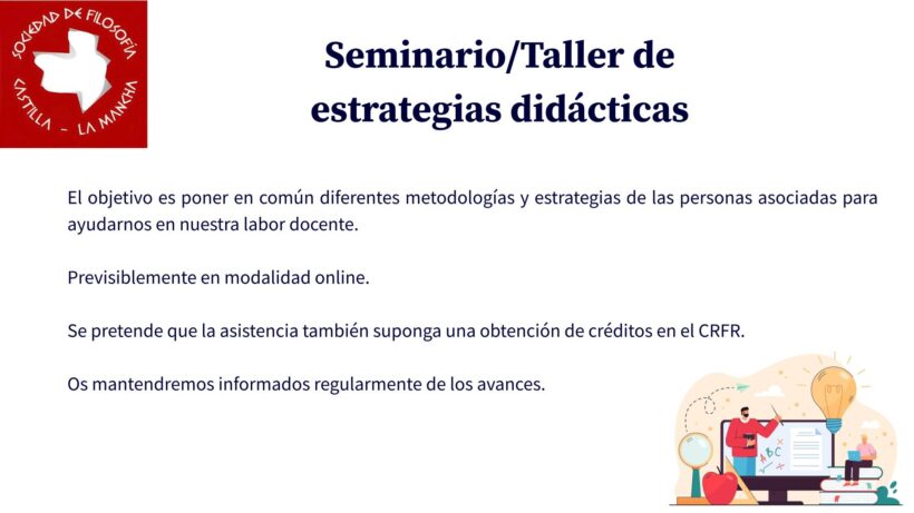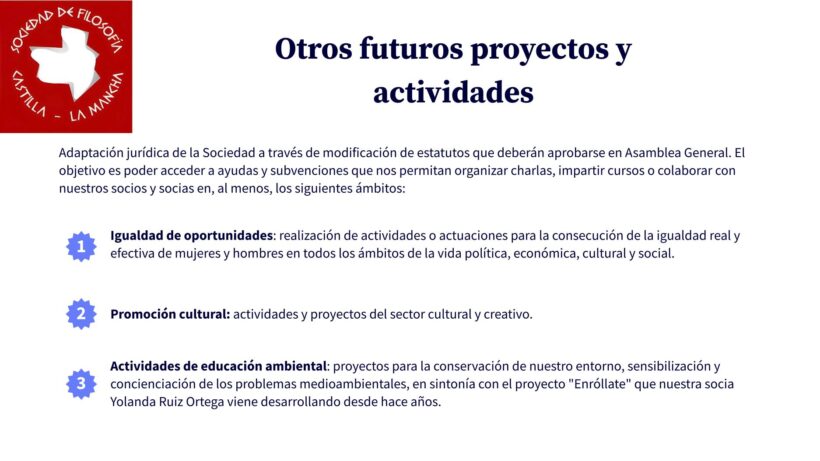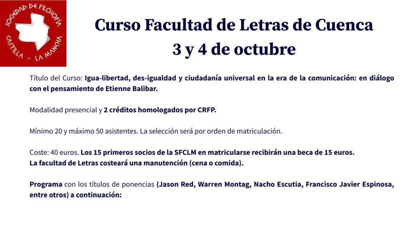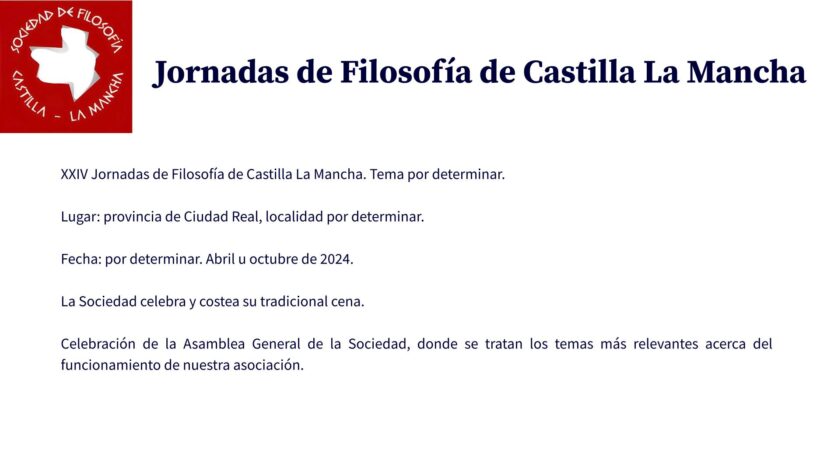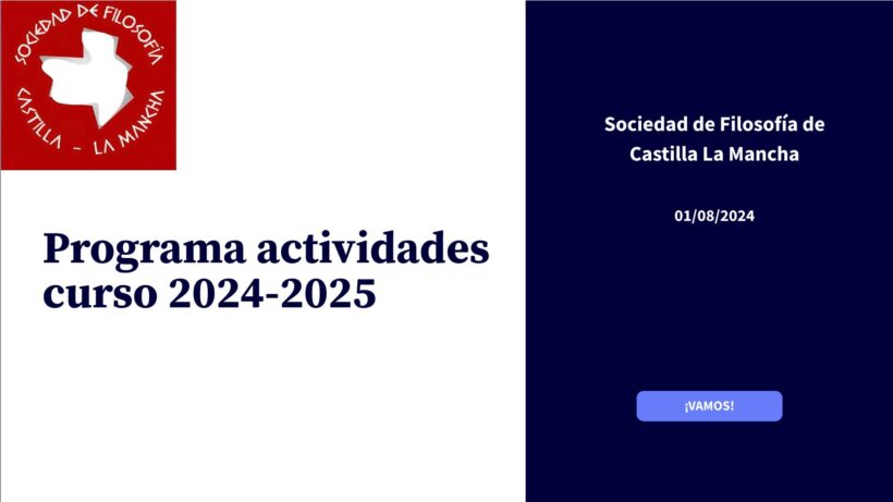 A continuación, os presentamos el Programa de Actividades 2024-2025 que la Sociedad de Filosofía de Castilla-La Mancha está actualmente preparando, dirigido tanto a todas aquellas personas que estén asociadas a la SFCLM como al público en general (profesorado de Educación Secundaria y Universidad, alumnado, etc.).
